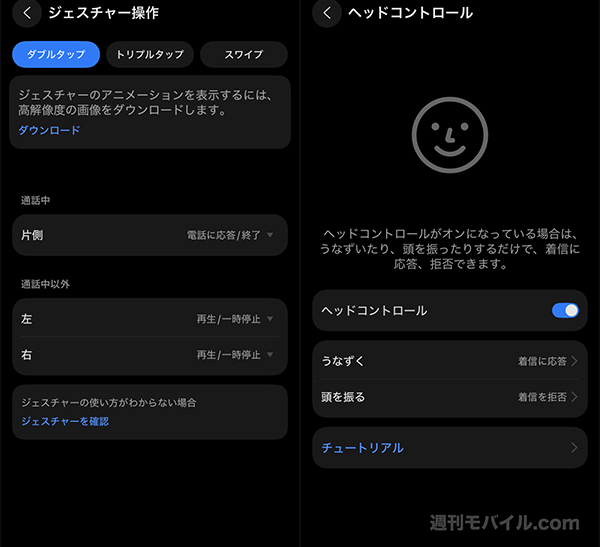 イヤホン側面、コンフォートビーンズと呼ばれる部分にはセンサーが搭載されており、再生や一時停止、音量調節といったコントロールがタッチ操作で行えます。また、頷いて受話、首を降って着信拒否といったヘッドコントロールも引き続き利用できます。