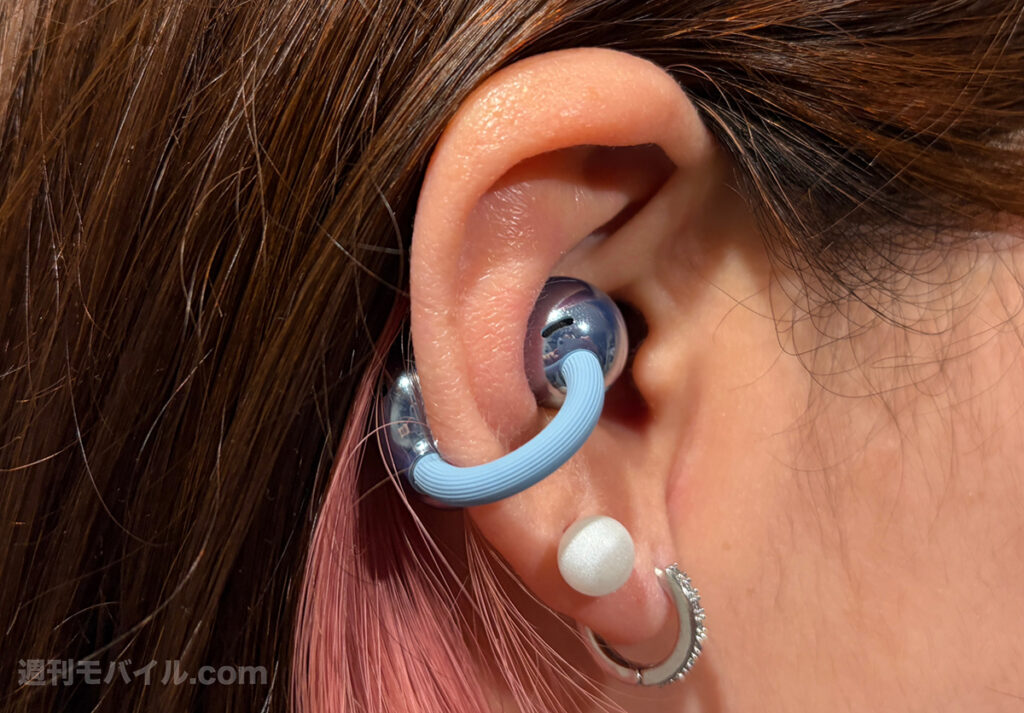 新モデルでは装着感がさらに進化しました。本体質量は片側9%軽量化した約5.1g、体積は片側11%削減され、物理的に軽く、着けやすく進化しています。