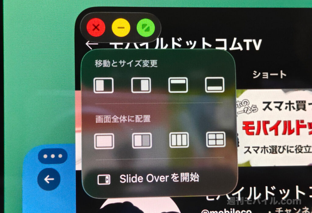 Macシリーズではお馴染みの、3色のアイコンが左上に追加されているため、マウスやトラックパッドでの操作もしやすくなりました。このウィンドウコントロールを長押しすると、アプリをタイル形式で3分割、4分割に配置できるのもなかなか便利です。