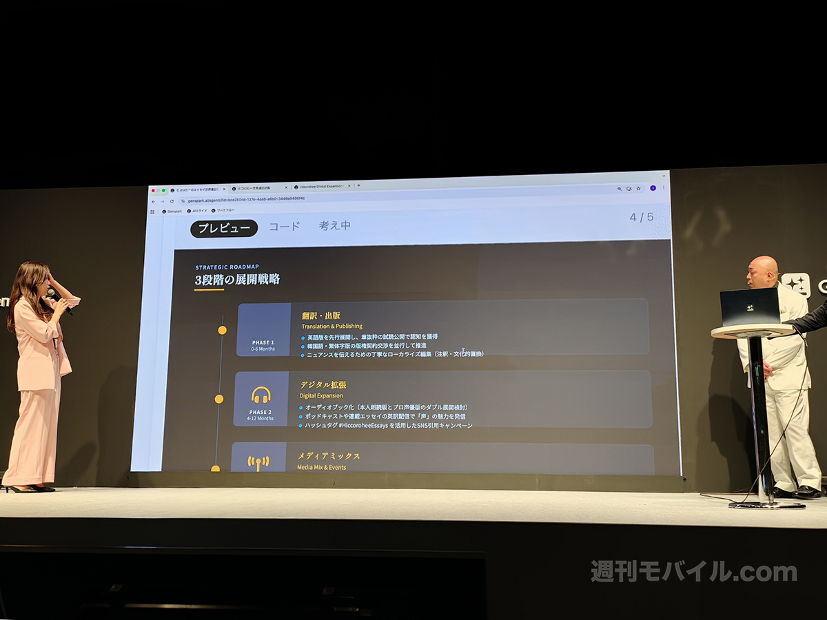 本日の発表会では、芸能人のヒコロヒー氏と錦鯉が登壇。「Genspark、芸能人のヒコロヒーのエッセイを全世界に広める計画を考えて、5ページの資料にしておくれ」というシンプルな指示だけで、約5分でプレゼンテーション資料が完成する様子が実演された。