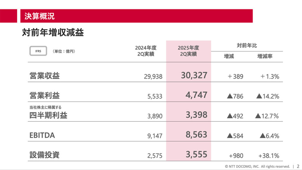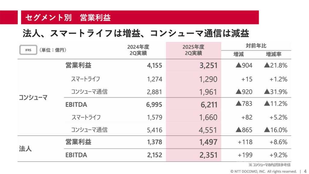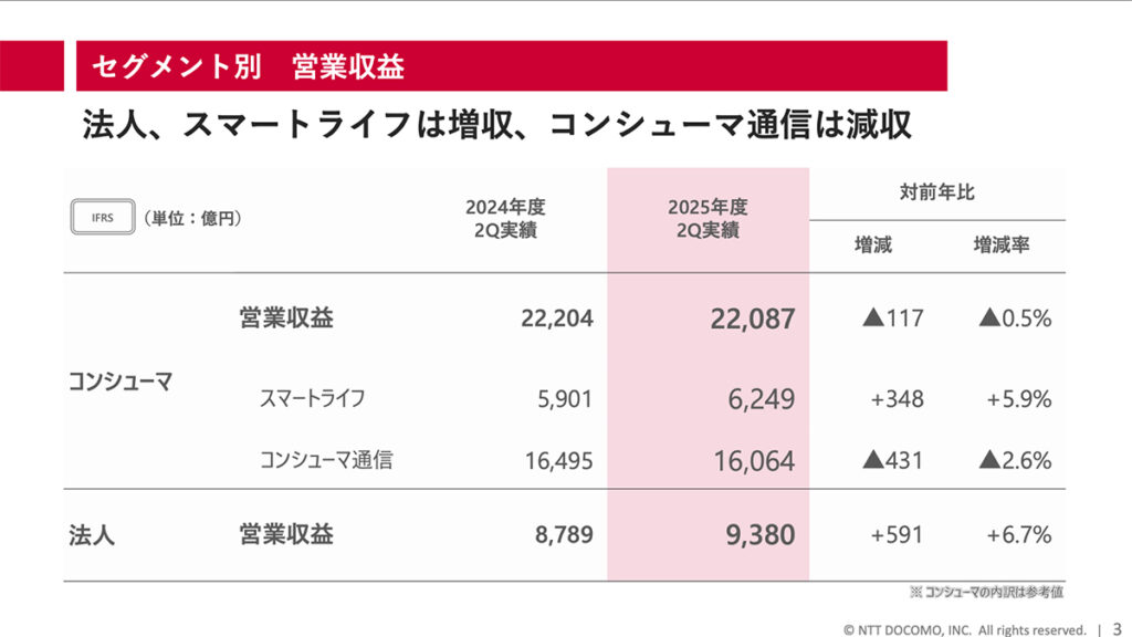 ドコモの2025年度第二四半期決算では、営業収益が3兆327億円(前年比1.3%増)、営業利益は4747億円(前年比14.2%減)、四半期利益は3398億円(前年比12.7%減)となります。法人、スマートライフセグメントで増収増益を達成した一方、コンシューマー通信事業が減収減益となり、足を引っ張る形になりました。