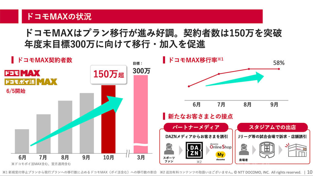 これまでも、デュアルバンド対応MMU(大容量通信に対応した最新型基地局装置)の導入、HPUEの開始、Sub6対応レピーターの導入など、急ピッチで通信品質の改善に取り組んでいるドコモですが、ユーザーの離脱が加速する前に、目に見えた結果を残せるのかが注目ポイントとなるでしょう。また、第2四半期ではARPUが3960円まで拡大し、ドコモMAXの加入者が150万を突破、解約率は0.69%にとどまるなど、明るい話題もあるため、弱点の早期改善に期待したいところです。