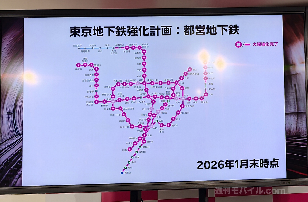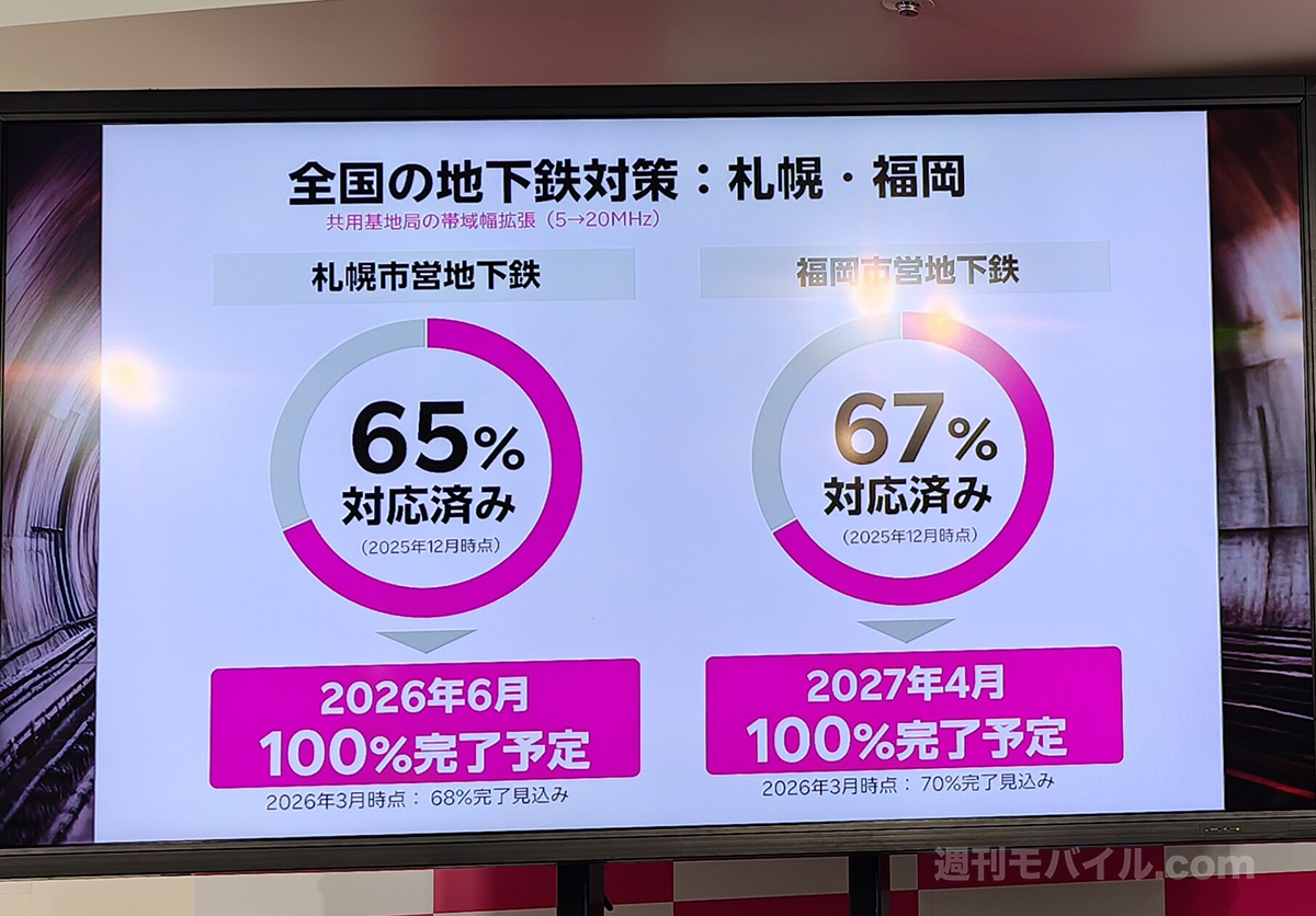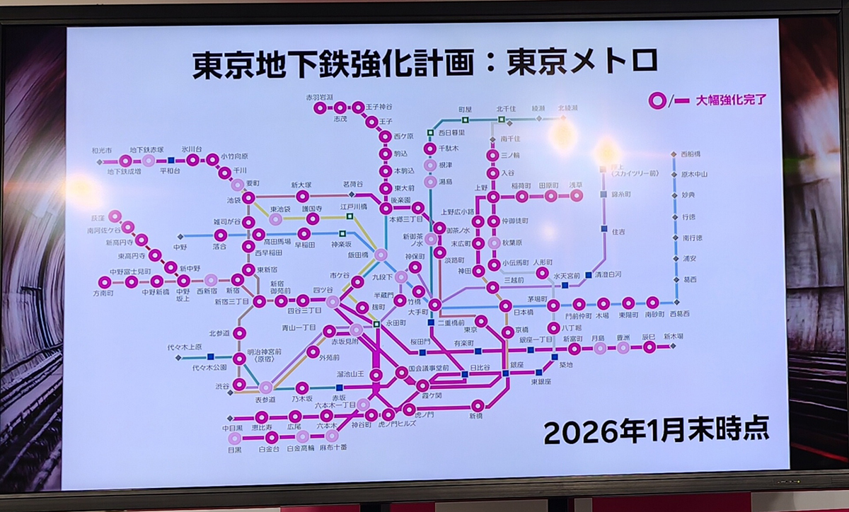 2026年1月末時点で、東京メトロおよび都営地下鉄の主要区間では、工事が前倒しに進んでおり、基地局の帯域幅を5MHzから20MHzへと拡張する工事が完了したとのこと。これにより95%はカバーが可能で、残り5%は7月までに完了予定とされています。