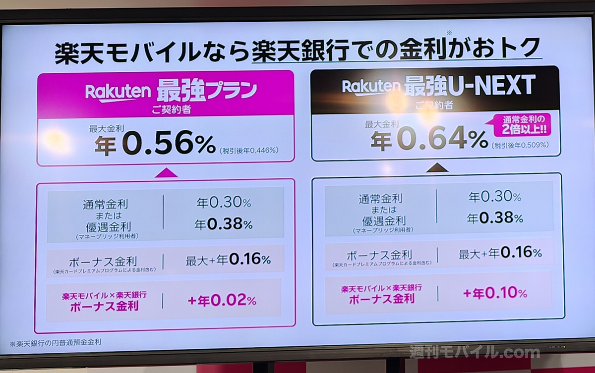 楽天モバイルユーザーで楽天銀行の口座を持っている場合は、金利がよりお得になります。すでに発表されているものではありますが、Rakuten最強プランユーザーなら最大年0.56%、Rakuten最強U-NEXTプランユーザーなら最大年0.64%となります。