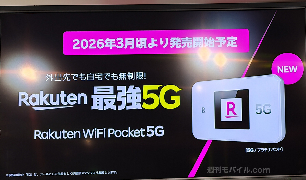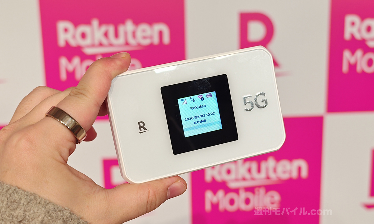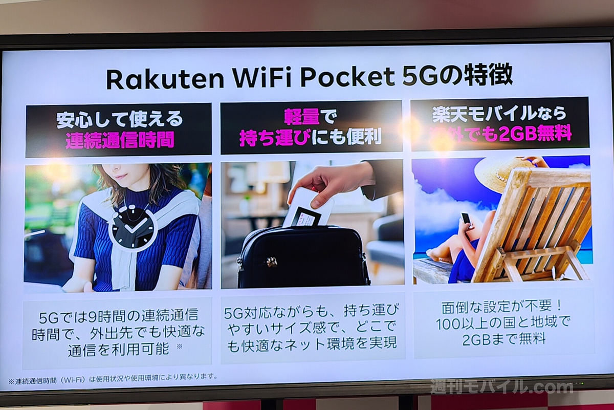 新たに5G、プラチナバンドに対応したモバイルWi-Fiルーター「Rakuten Wi-Fi Pocket 5G」も発表。同時接続台数は24台で、海外100以上の国と地域でも2GBまで無料で利用できます。発売は3月の予定となります。