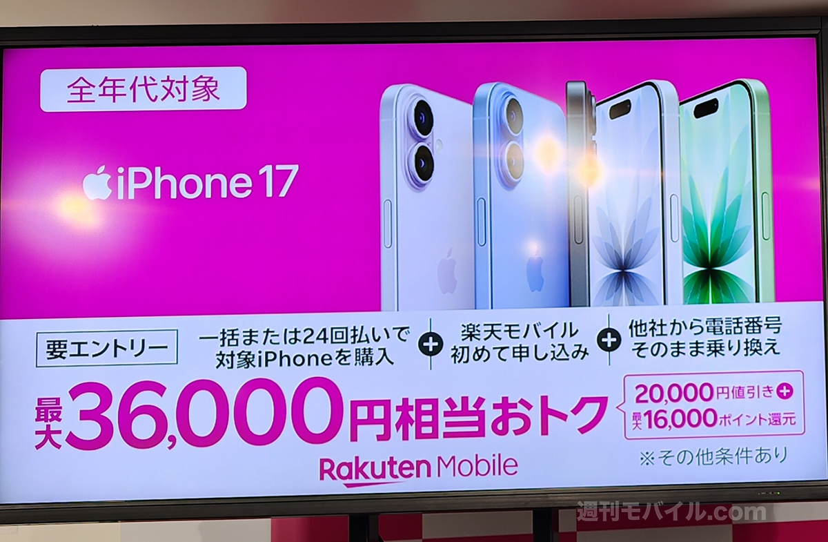 また、新たにiPhone 17もMNPでの割引対象に追加されます。初めて楽天モバイルに申し込む場合は、最大3万6000円相当がお得になります。