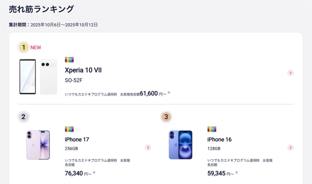 公表されている売れ筋ランキングは、ドコモオンラインショップで集計期間2025年10月6日~2025年10月12日までの結果です。ソニーの新型ミドルレンジ「Xperia 10 VII」は、2025年10月9日発売が開始されたので、初登場で首位を獲得したことになります。