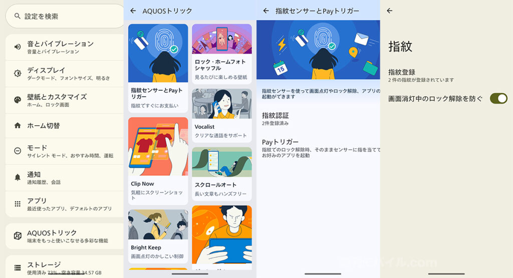 「設定」→「AQUOSトリック」→「指紋センサーとPayトリガー」→「指紋認証」→「画面消灯中のロック解除を防ぐ」をONにする