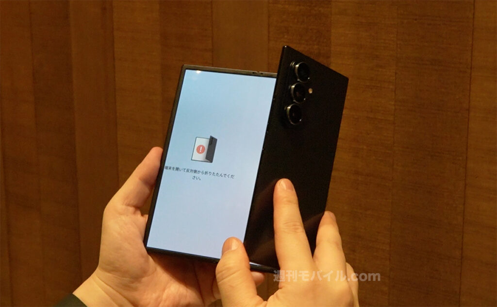 面白いなと思ったのが、折りたたむ順番を間違えた時の動作。逆側から折りたたむと画面上に注意表示が出るのと同時にバイブレーションで本体が振動してくれるため、間違っていると一発で分かります。ちなみに、右側から間違えて折りたたんでも壊れることはありません。