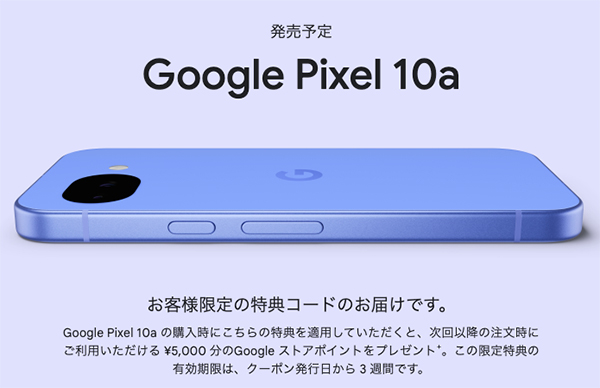 ちなみに、本日「Google Pixel 10a」向けのクーポンが届きました。特典コードを入力して、「Google Pixel 10a」を購入すると、次回以降に使える5,000円分のストアポイントがもらえる内容になっています。