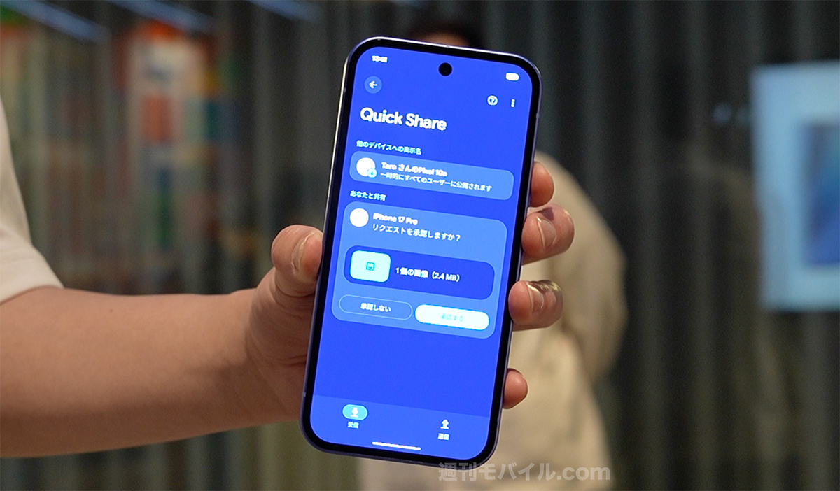Pixel「a」シリーズとしては初となる「Quick Share」機能を使って、Appleの「AirDrop」と直接データ送受信が可能です。この他、IP68防水防塵やおサイフケータイ、最大7年間のOS・セキュリティアップデートにも対応です。