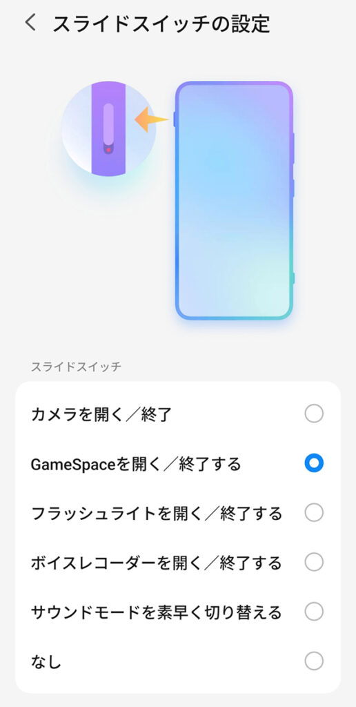 側面には音量ボタン、電源ボタンのほか、右側面にシャッターキー、左側面にスライドスイッチが搭載されています。シャッターキーは後述するとして、スライドキーはゲームスペースの起動、フラッシュライトのオン/オフ、ボイスレコーダーの開始/終了といったショートカットが割り当てられます。