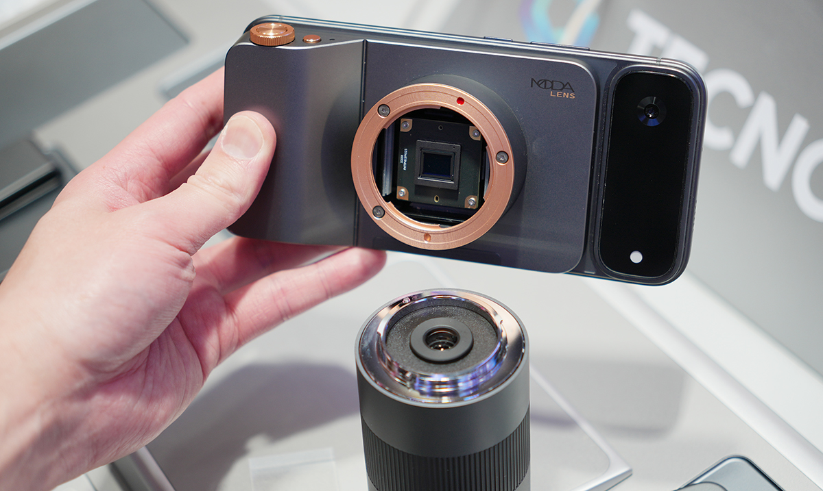 筆者が特に気になったのは「レンズ交換式カメラモジュール」です。マートフォン本体と接続して撮影することが可能。レンズ交換式カメラを装着して本格的に撮影する場面は、一般ユーザーにとってそれほど多くないでしょう。だからこそ、普段は通常のスマートフォンとして使い、必要なときだけカメラモジュールを装着できるというスタイルは、魅力的に感じました。ただし、今回展示されていたのはあくまでコンセプト機ということもあり、実際に試してみると接続がやや不安定に感じる場面もありました。今後の改良に期待したいポイントです。