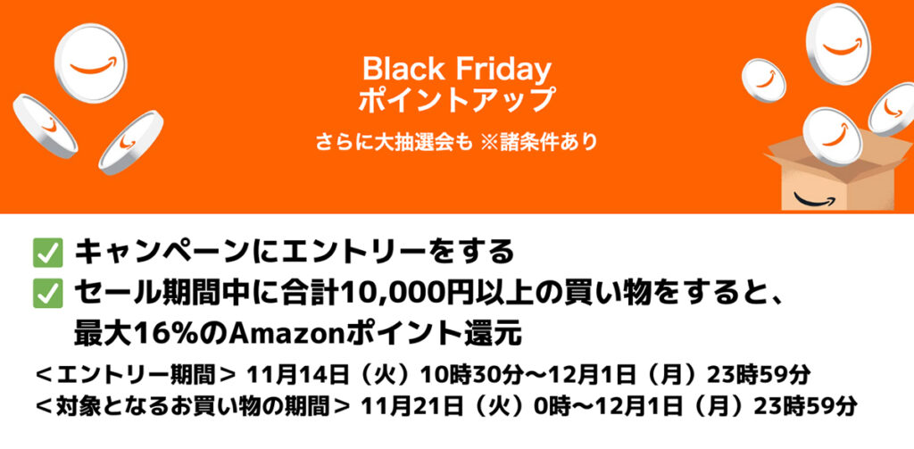 Amazon「ブラックフライデー2025」では、最大10,000ポイント還元ポイントアップキャンペーンが行われています。対象期間中に、キャンペーンにエントリーしてお買い物を合計1万円(税込)以上すると還元対象です。