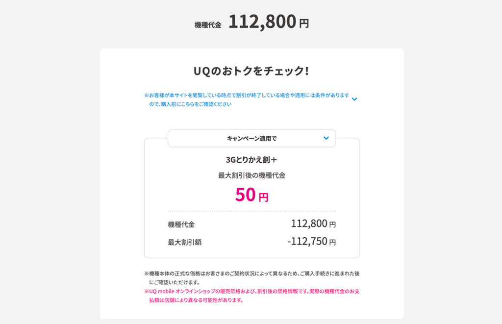 112,750円(3Gとりかえ割(スマホ):33,000円、3Gとりかえ割プラス:79,750円)