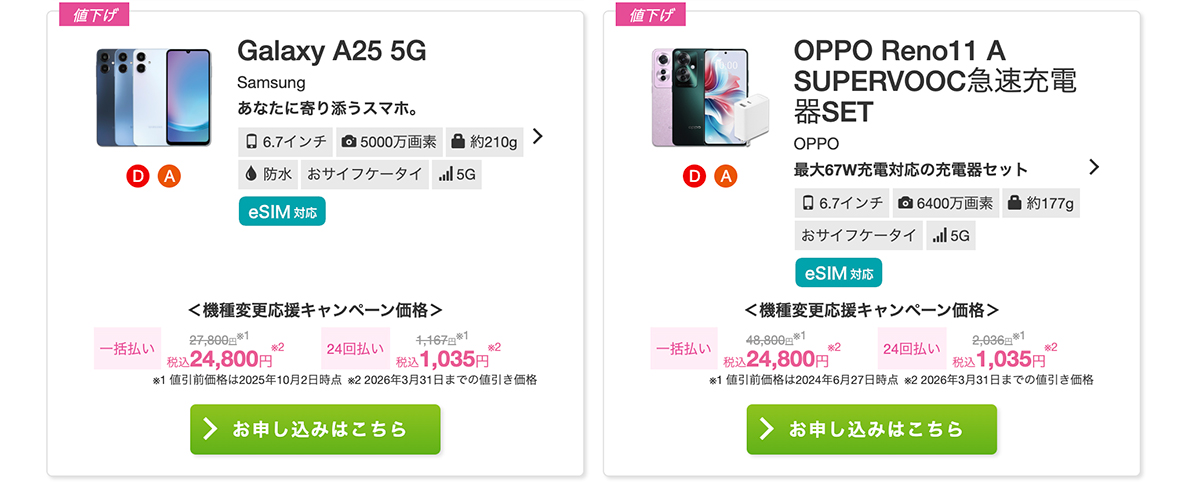 | Galaxy A25 5G | 2万7800円 | 2万4800円 |