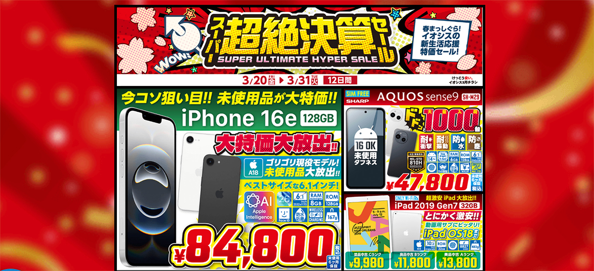 イオシスは「超絶決算セール」を2026年3月31日まで開催しています。様々な製品が安くなっていますが、未使用品「iPhone 16e」もセール対象。8万4800円(税込)で販売中です。
