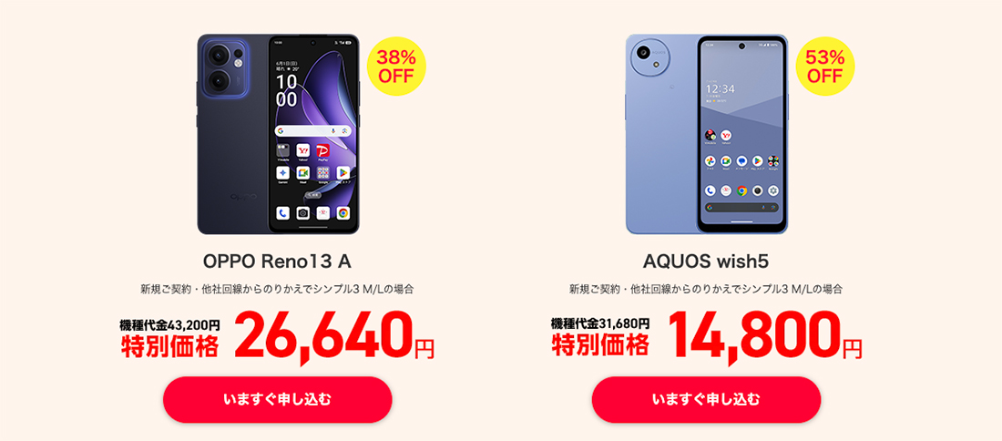 そんな「OPPO Reno13 A」が、今回ワイモバイルオンラインショップにて、今だけ他社からのりかえ(MNP)もしくは新規契約+シンプル3 M/Lプラン申し込みで、一括2万6640円で購入できます。