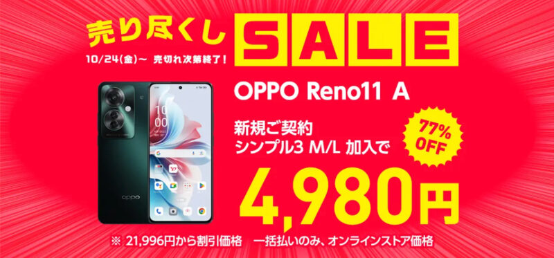 【特価セール】ワイモバイルにて「OPPO Reno11 A」が新規一括4980円。77%OFFに