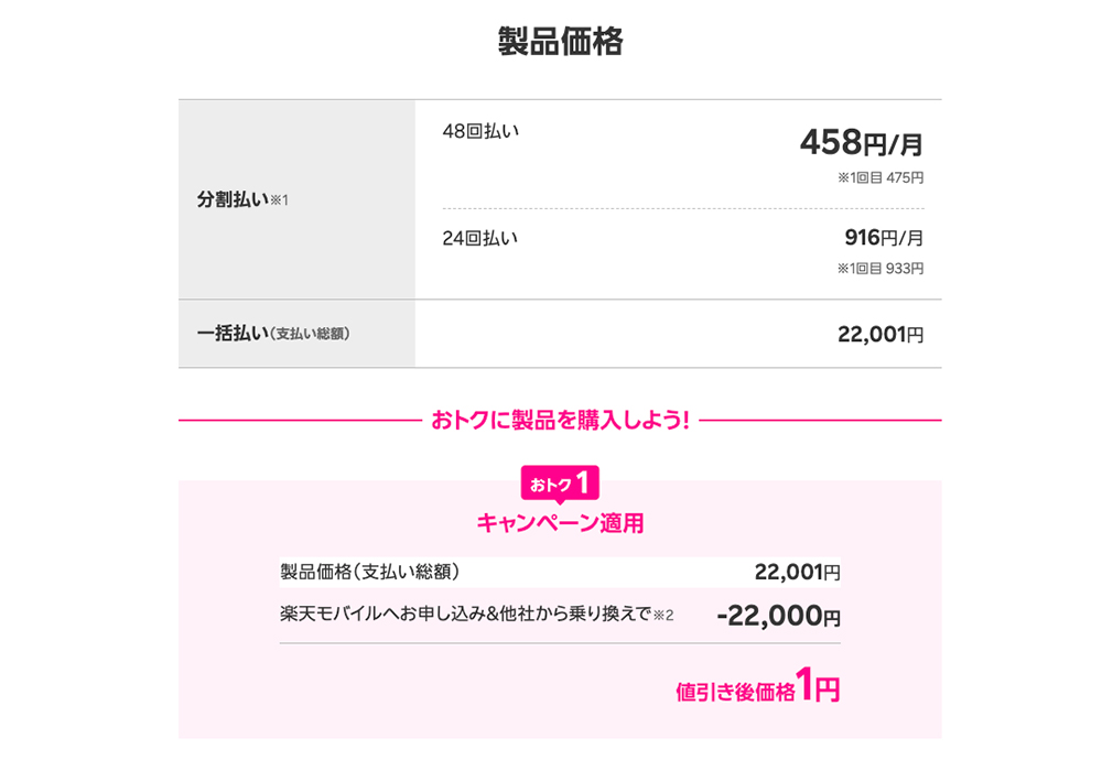 そんな一台が、楽天モバイルにて値下げされており、MNP契約なら一括1円で購入可能です。(記事内、全て税込)